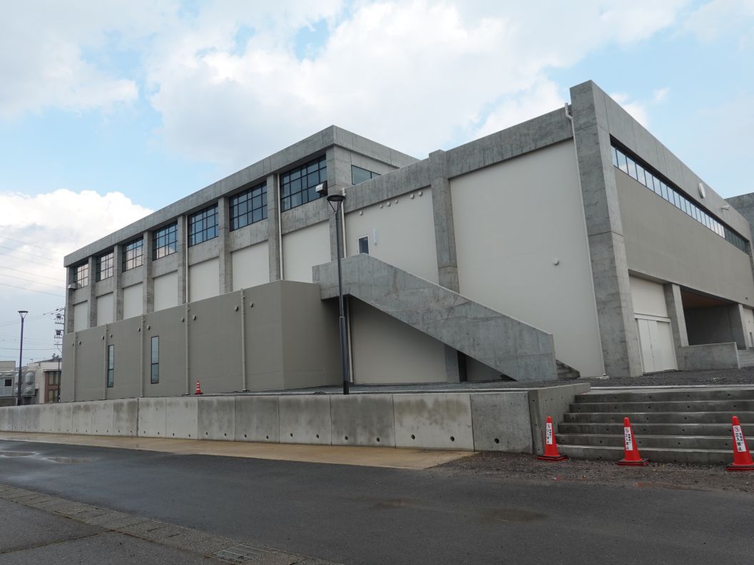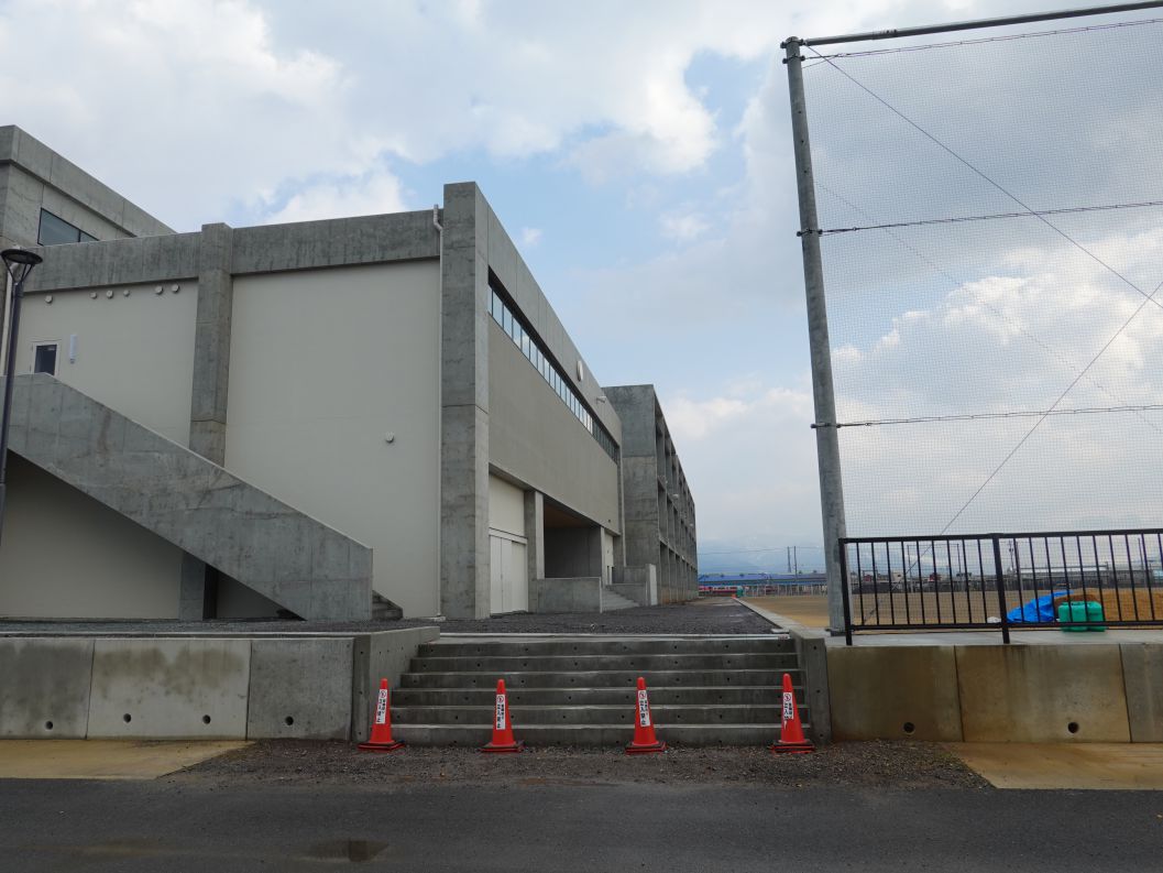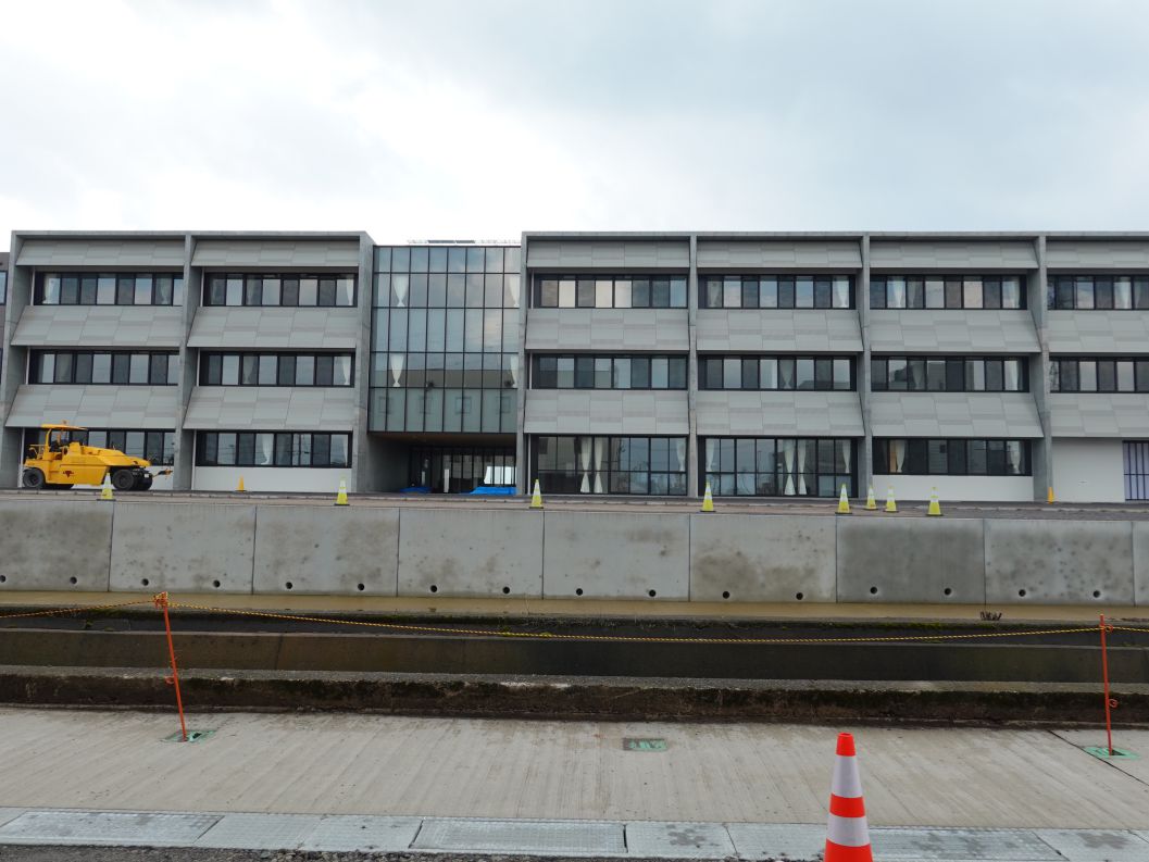 北西角です。体育館の壁はコンクリート打ちっぱなしです。敷地を囲っていた仮囲いがなくなりました。