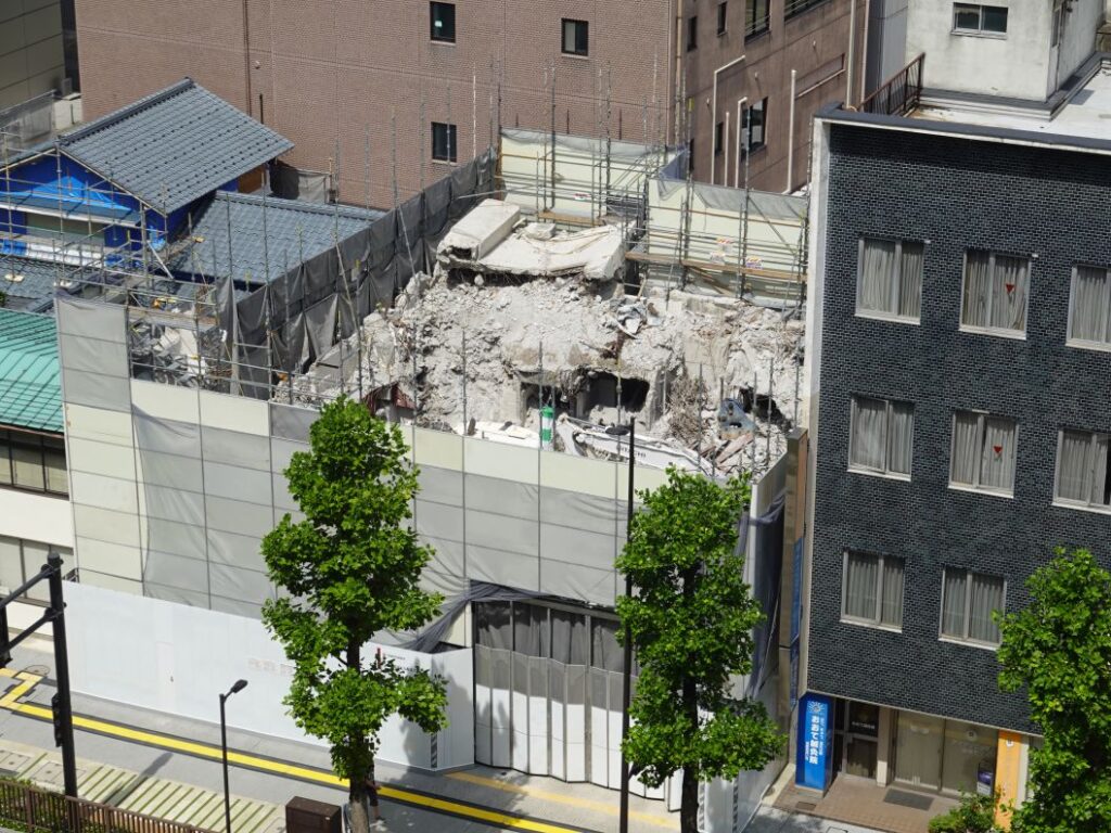 工事ゲートから空が見えるようになりました。2階を解体しています。