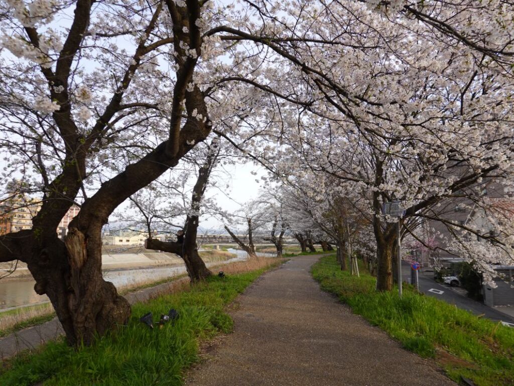 1分43秒、足羽川泉橋付近の桜並木を登校しています。2025年4月撮影