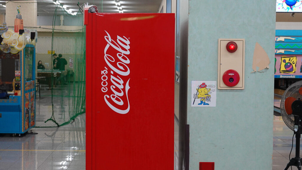 エアホッケー機の後ろにある壁の非常ベルがアニメと同じでしたので写真撮りましたが別の場所かも。