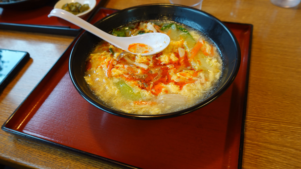 5分59秒、注文した料理が並びました。手前の唐麺だけアニメと合わせました。(2人で入店だったのでアニメの再現はできず・・・)