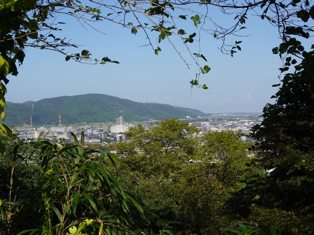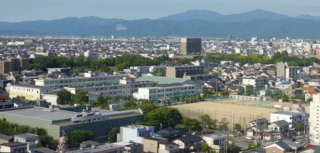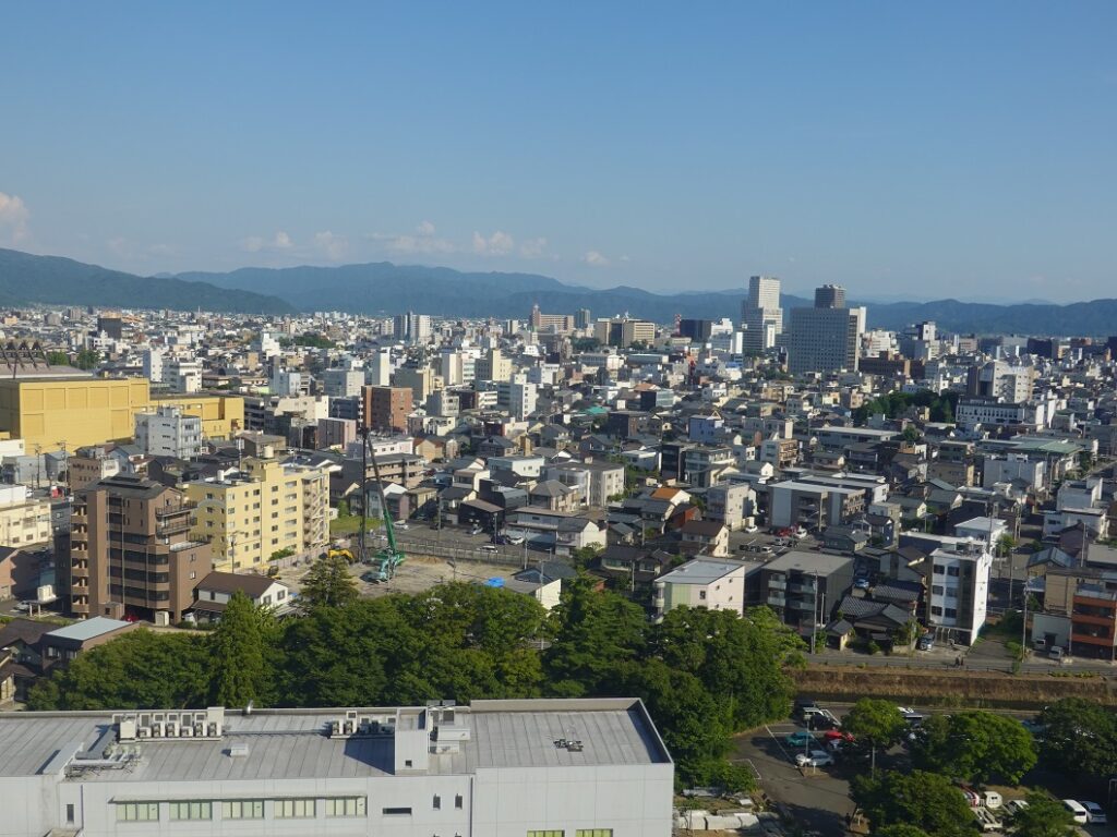 近くの福井大学13階からの風景で代用します。アニメではホテルフジタ、春山合同庁舎、フェニックスプラザが描かれています。