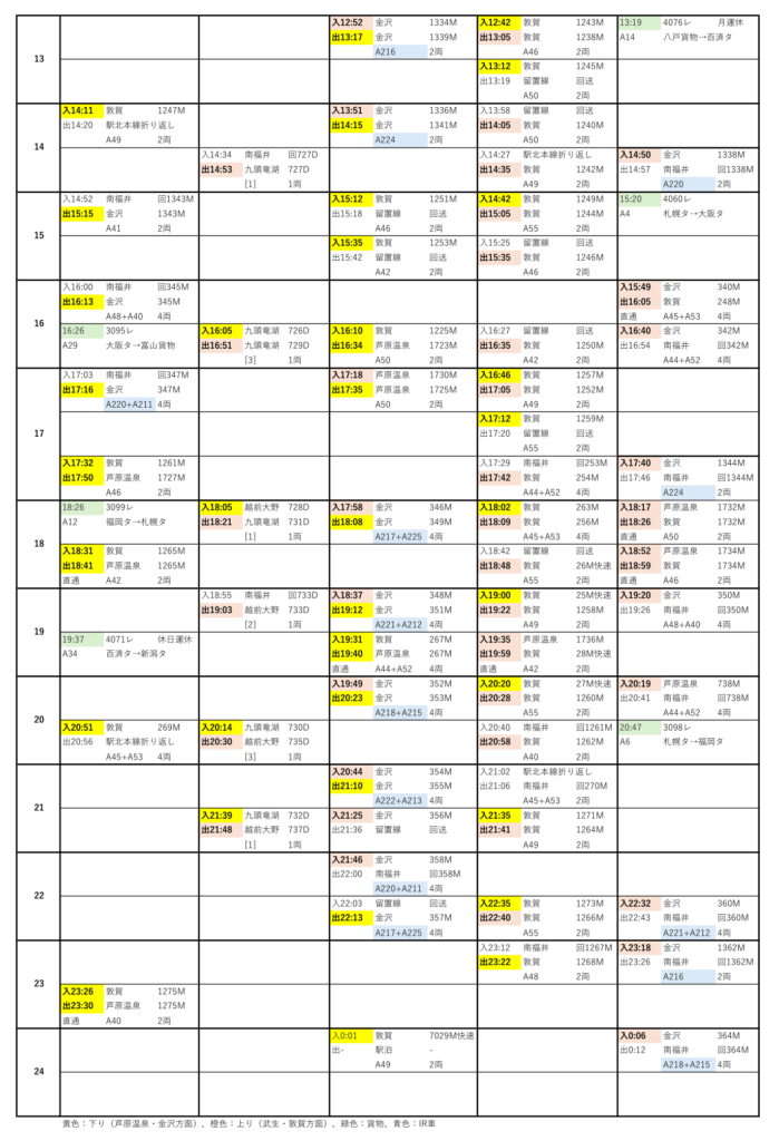 福井駅運用時刻表(画像データ)です。拡大or保存すると詳細が確認できます。