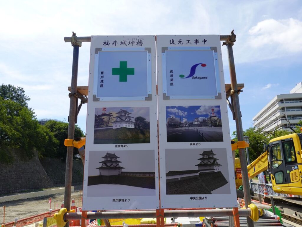 福井城南西角では坤櫓(ひつじさるやぐら)および本丸西側土塀の復元工事が行われています。ここでは工事の概要と2025年8月中旬現在の様子を紹介します。