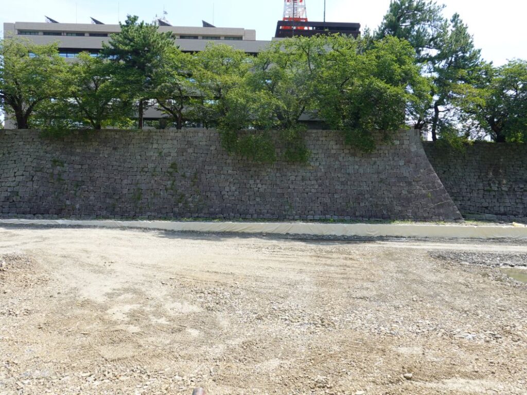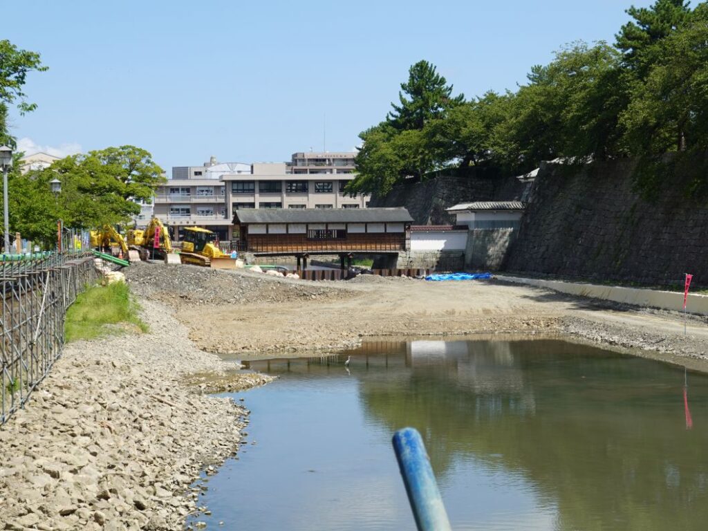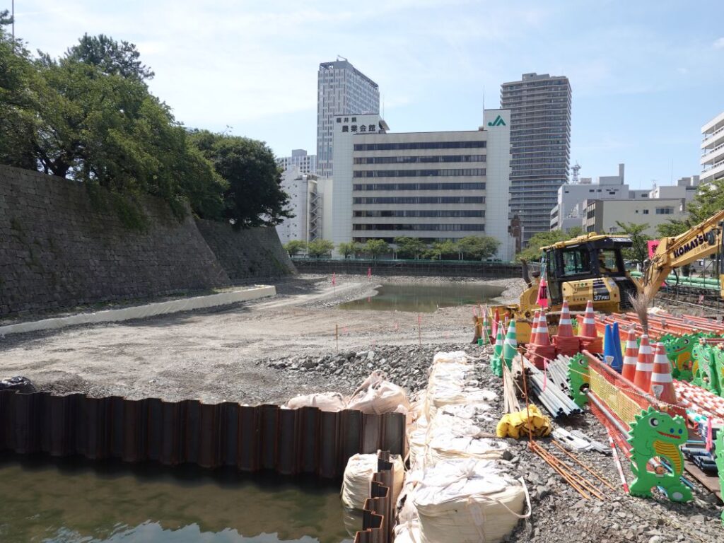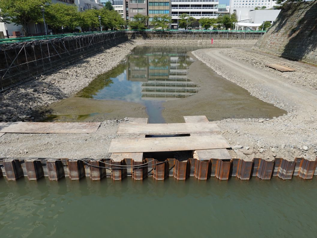 2025年8月16日の様子です。お堀南西の水が抜かれ、工事ヤードを整備しています。