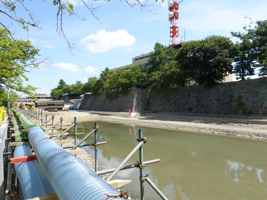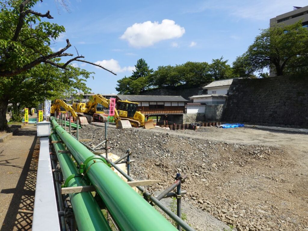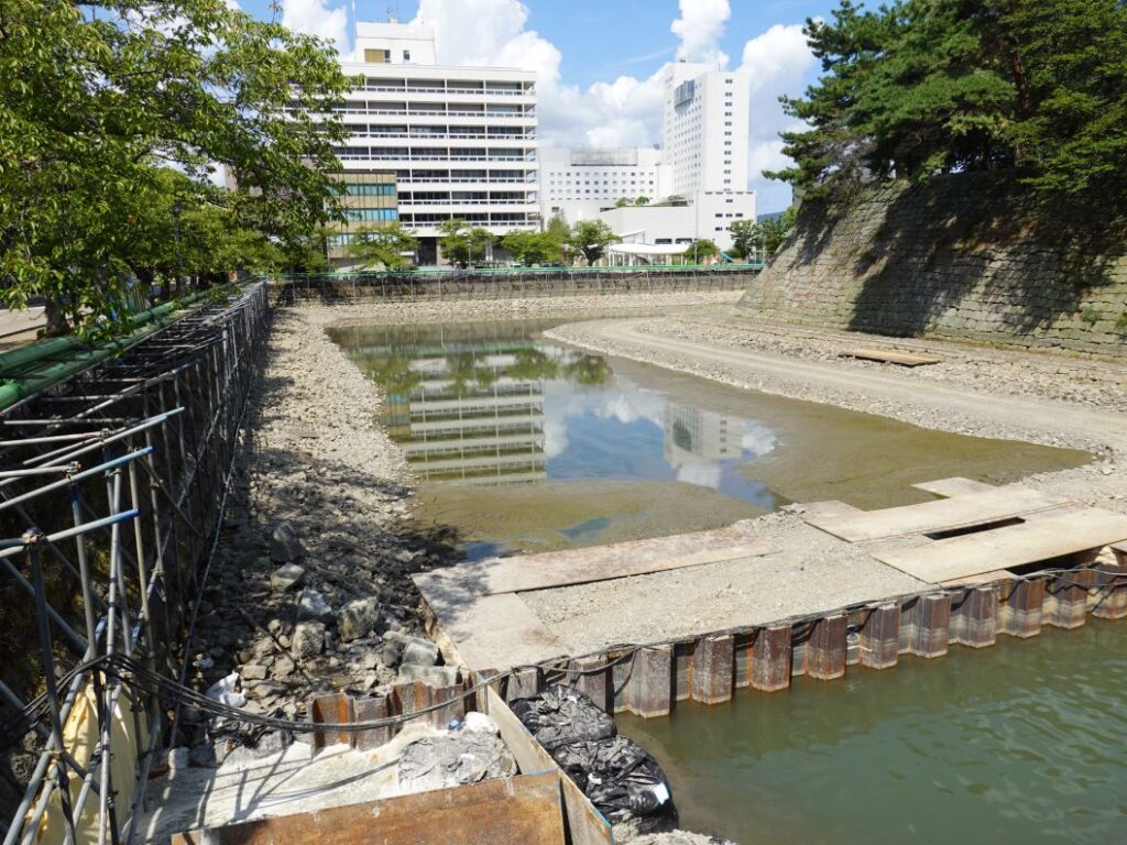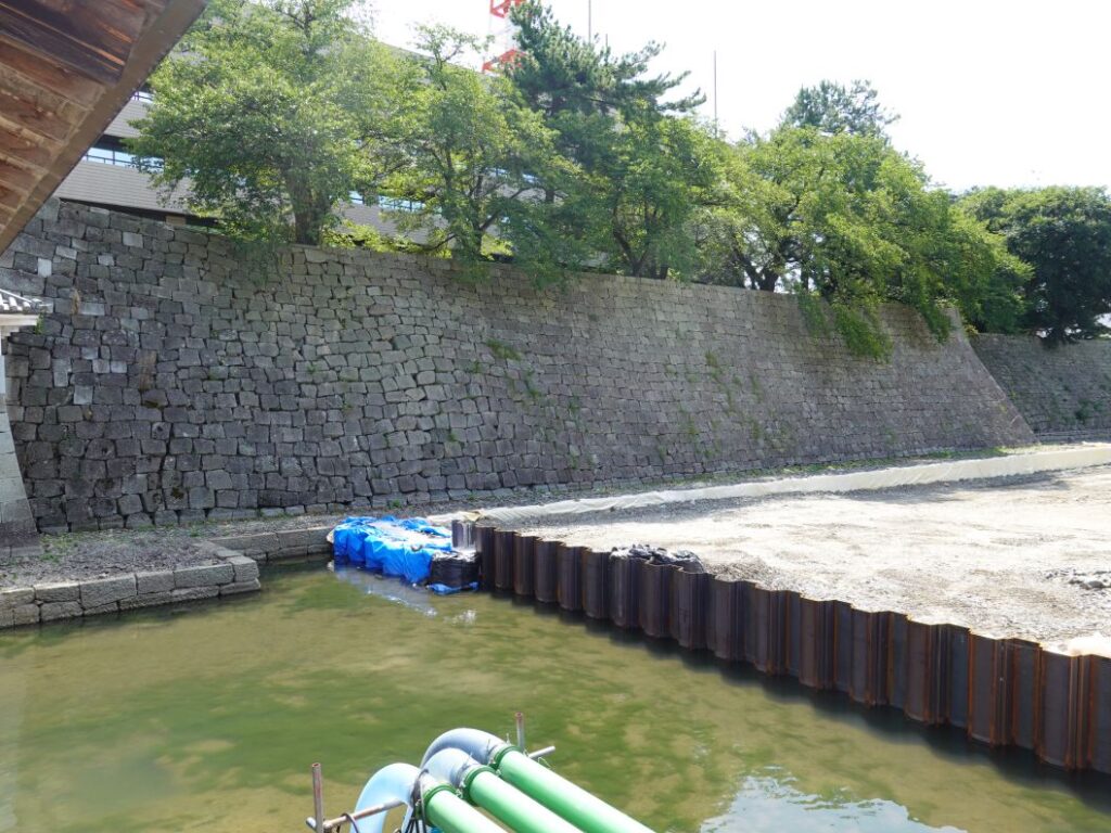 2025年8月16日の様子です。お堀南西の水が抜かれ、工事ヤードを整備しています。