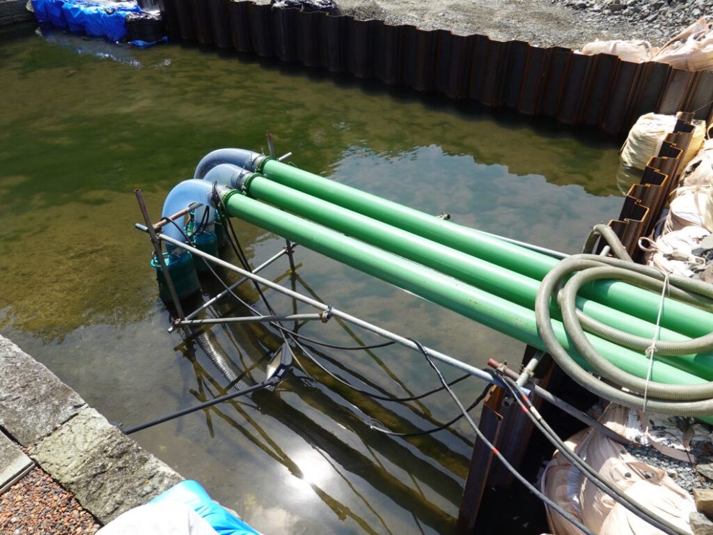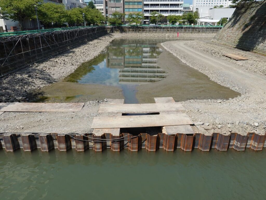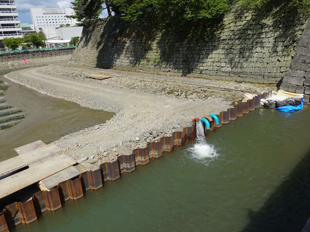 水が抜かれたお堀、手前には水抜きパイプが設置されています。