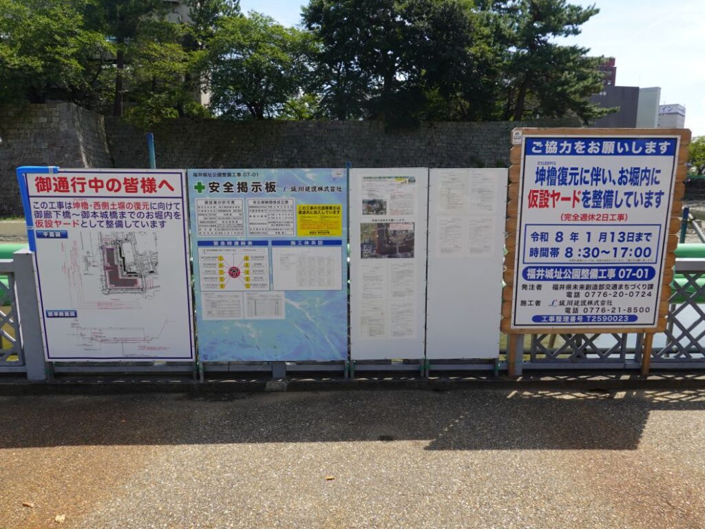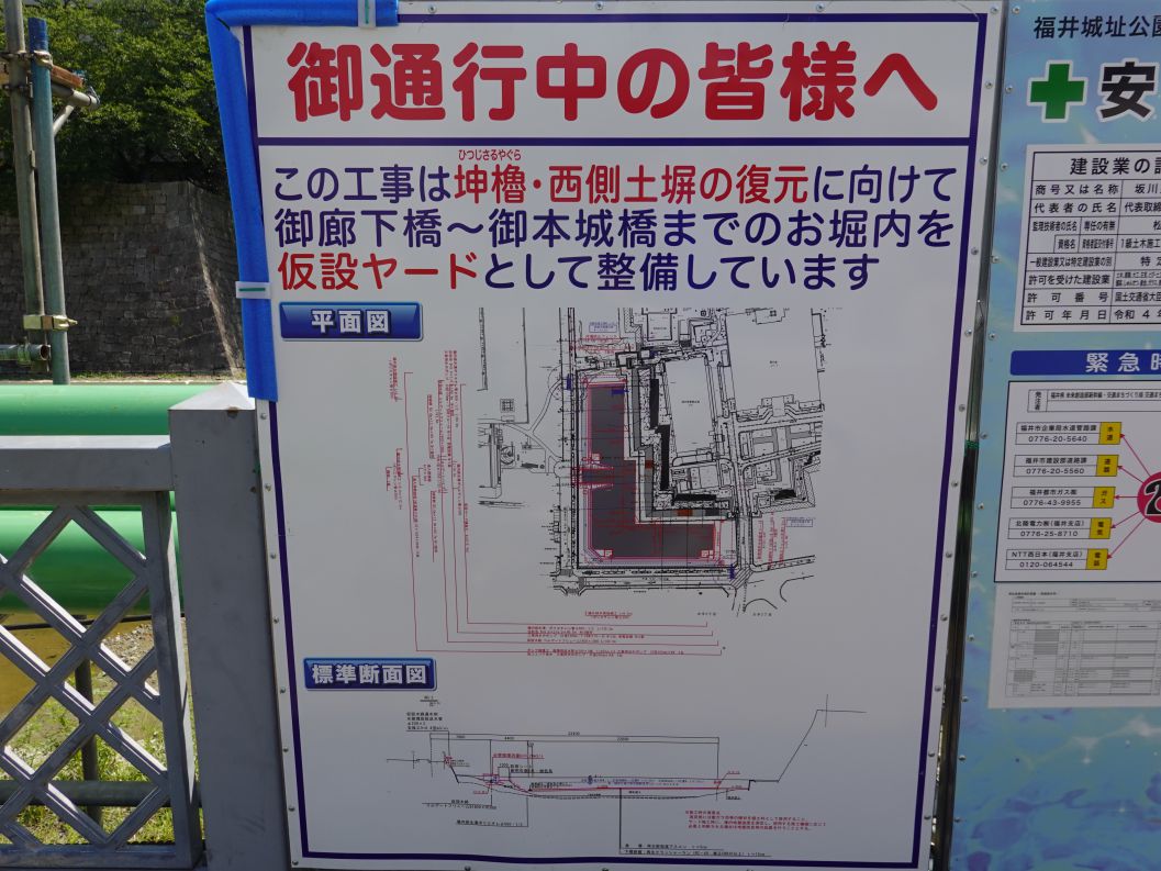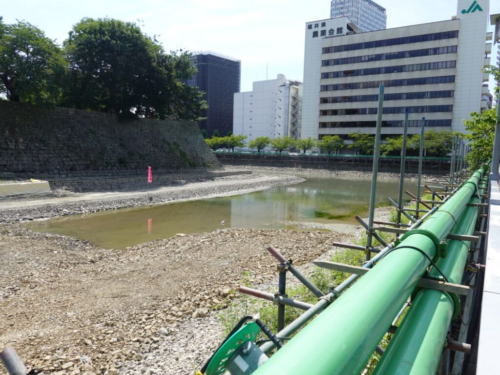 以上、【福井城坤櫓復元工事の様子1】お堀に工事ヤード設置開始 2025.8 でした。