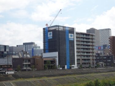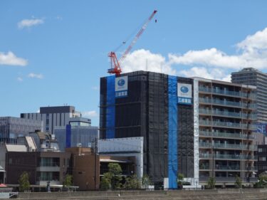 桜橋からです。隣の10階建てマンションの高さを超えました。ここからさらに5階分高くなります。