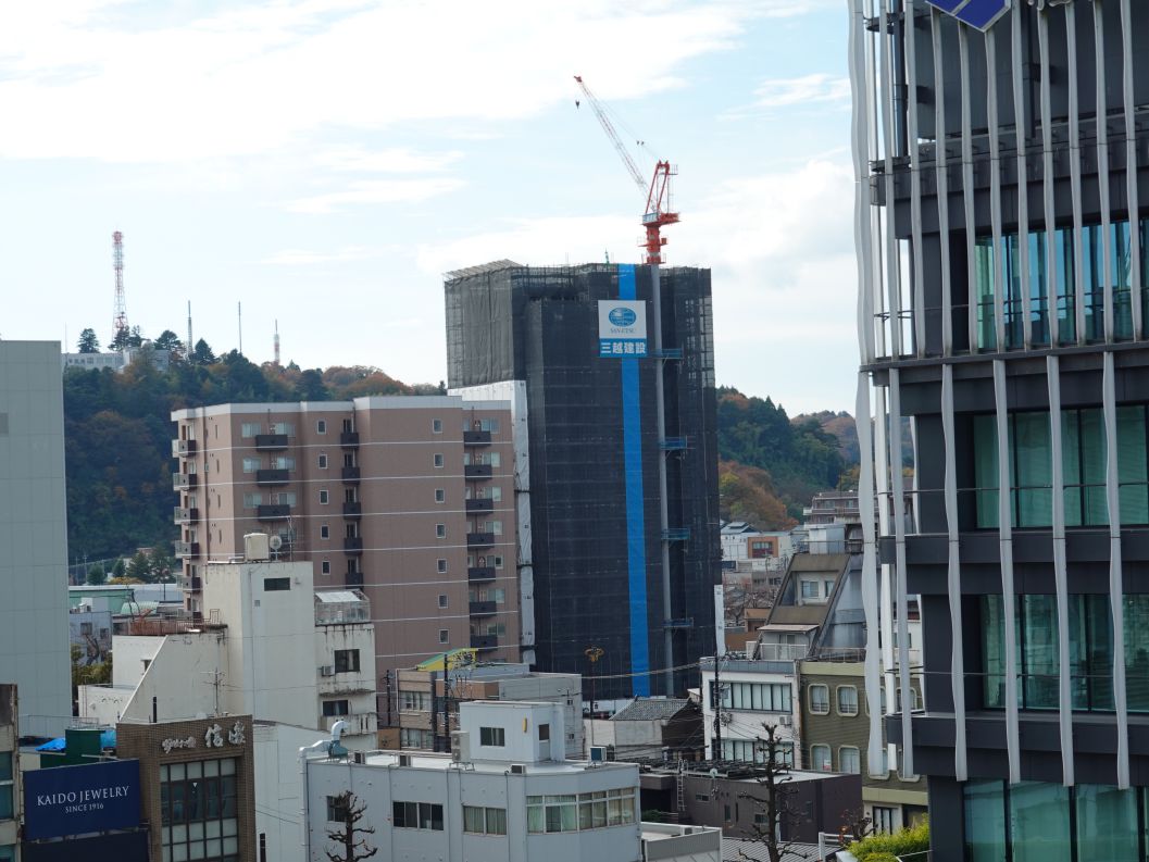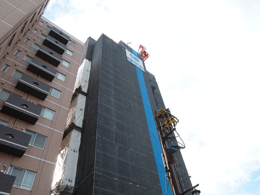 繊協ビル駐車場屋上からです。最上階の15階を施工しています。