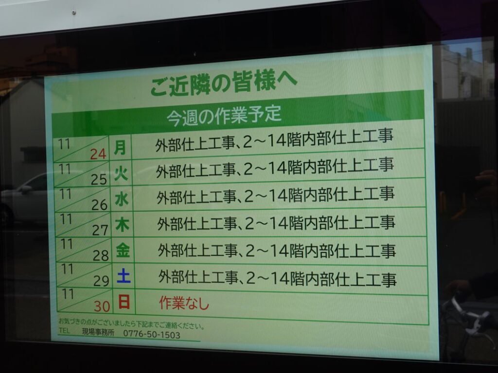 2025年11月24日の週の作業予定です。外部仕上工事、2~14階内部仕上工事が行われています。
