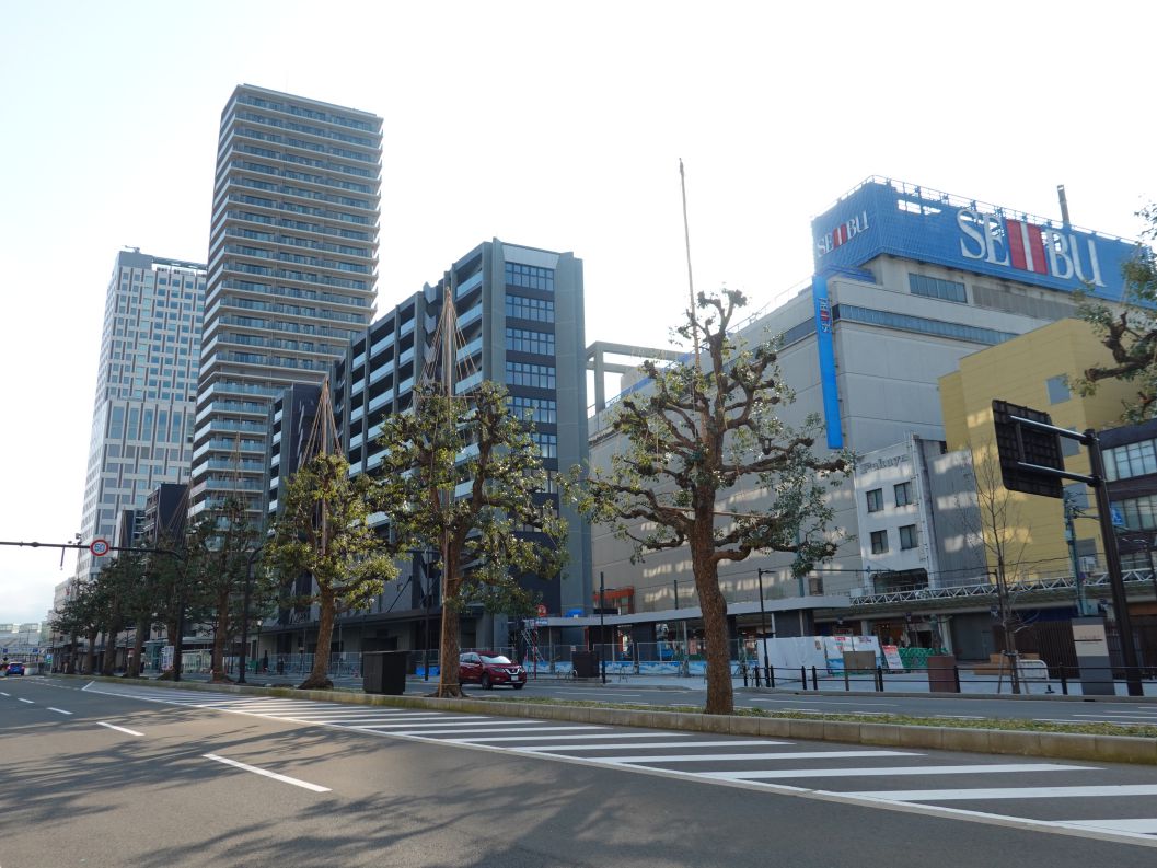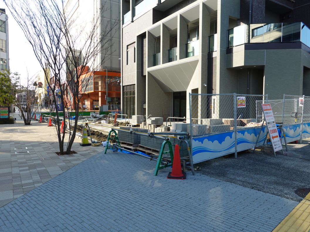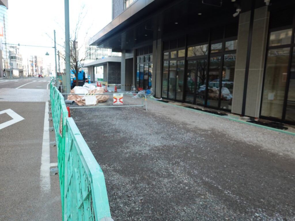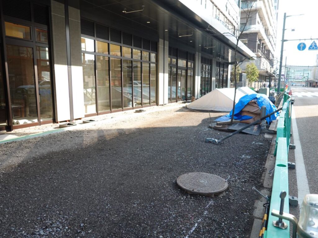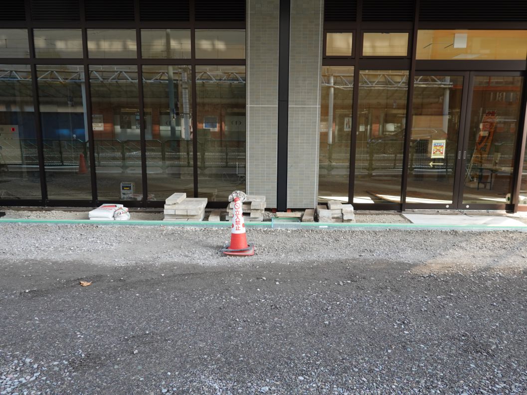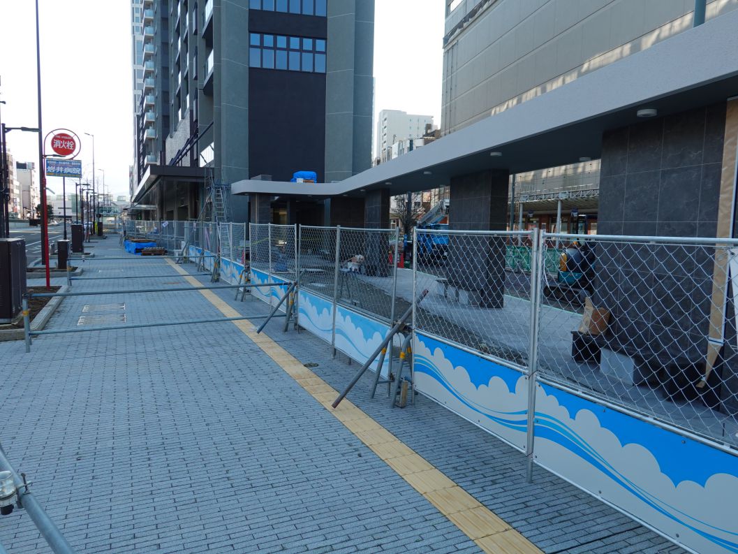 中央大通り側のフェンスに貼ってあった白いシートがはがされ、1階全体が見えるようになりました。
