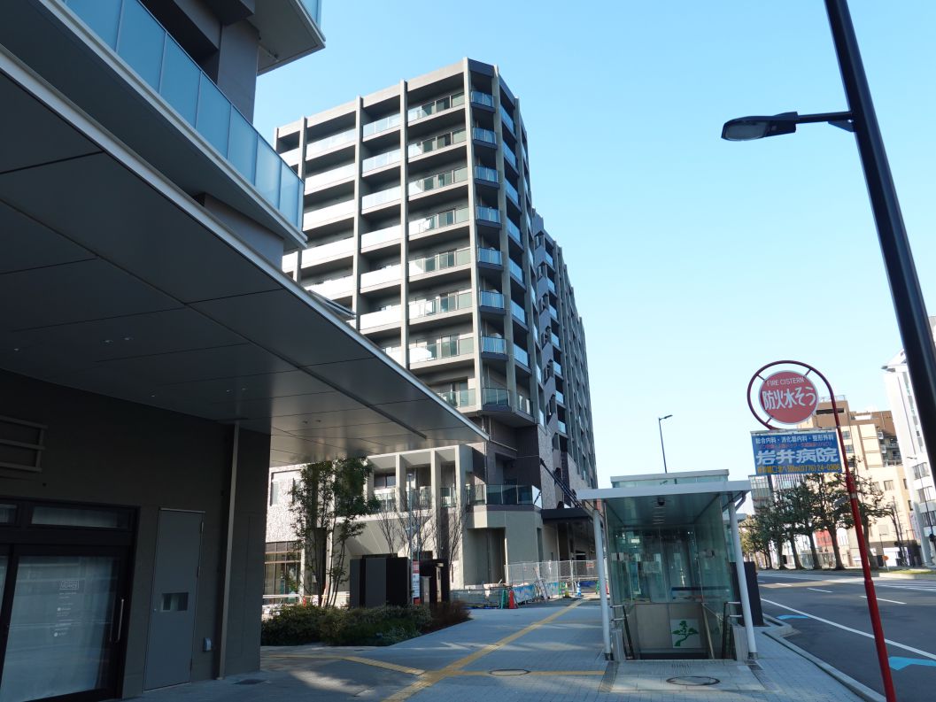 JR福井駅西口の中央大通りと電車通りに挟まれた三角地帯で行われている再開発事業です。福井駅側は「A街区」として100m級の2本の高層ビルが建設され、大名町交差点側は「B街区」として10階建ての複合マンションが建設されます。施設は商業施設、医療福祉施設、分譲住宅(タカラレーベル)で構成されます。
