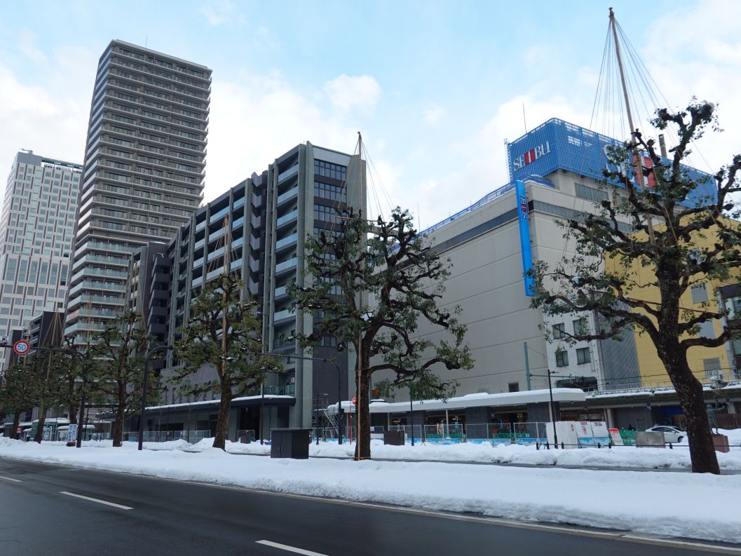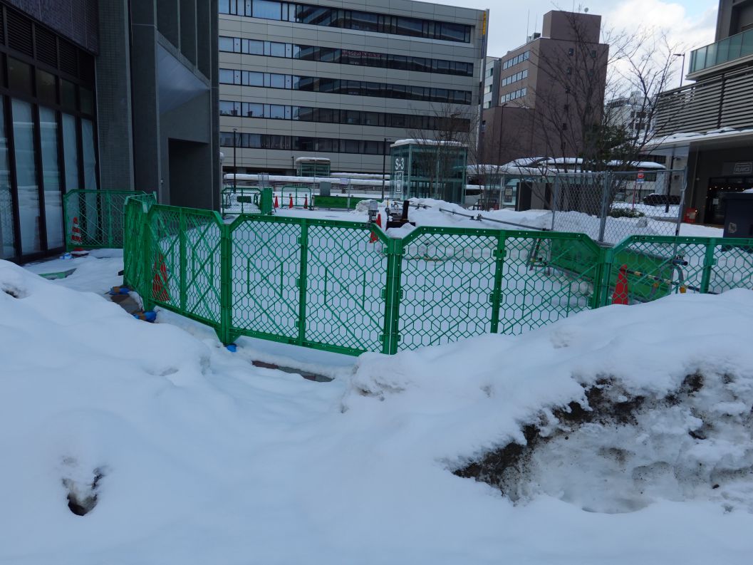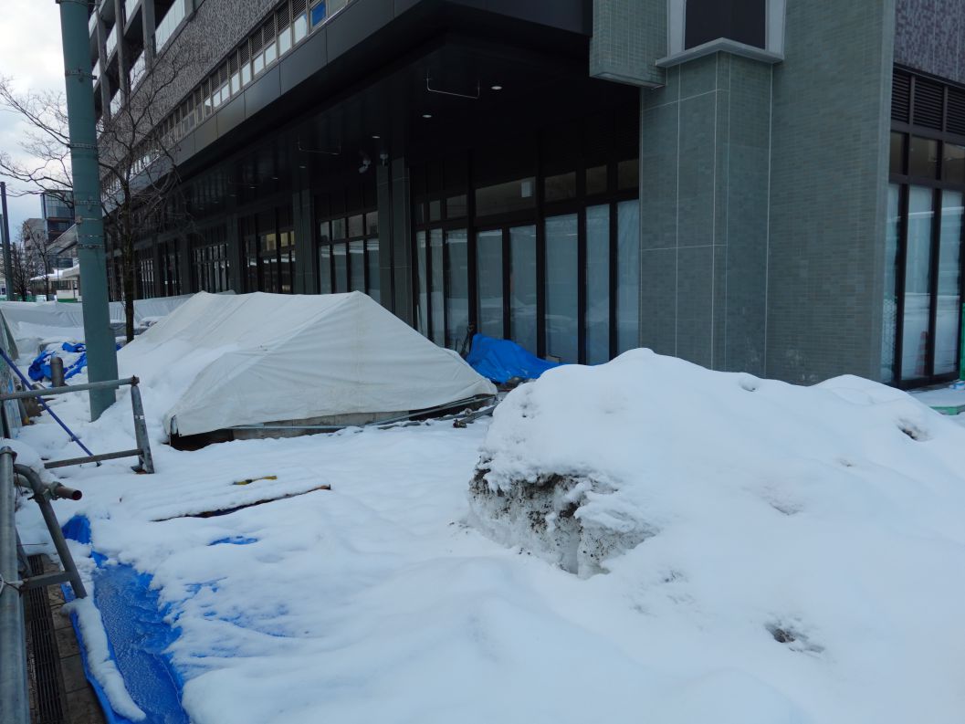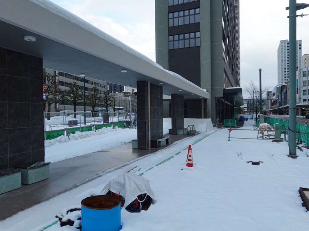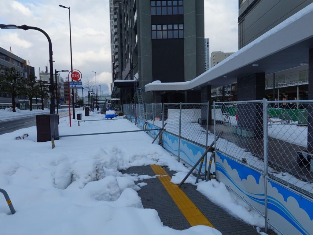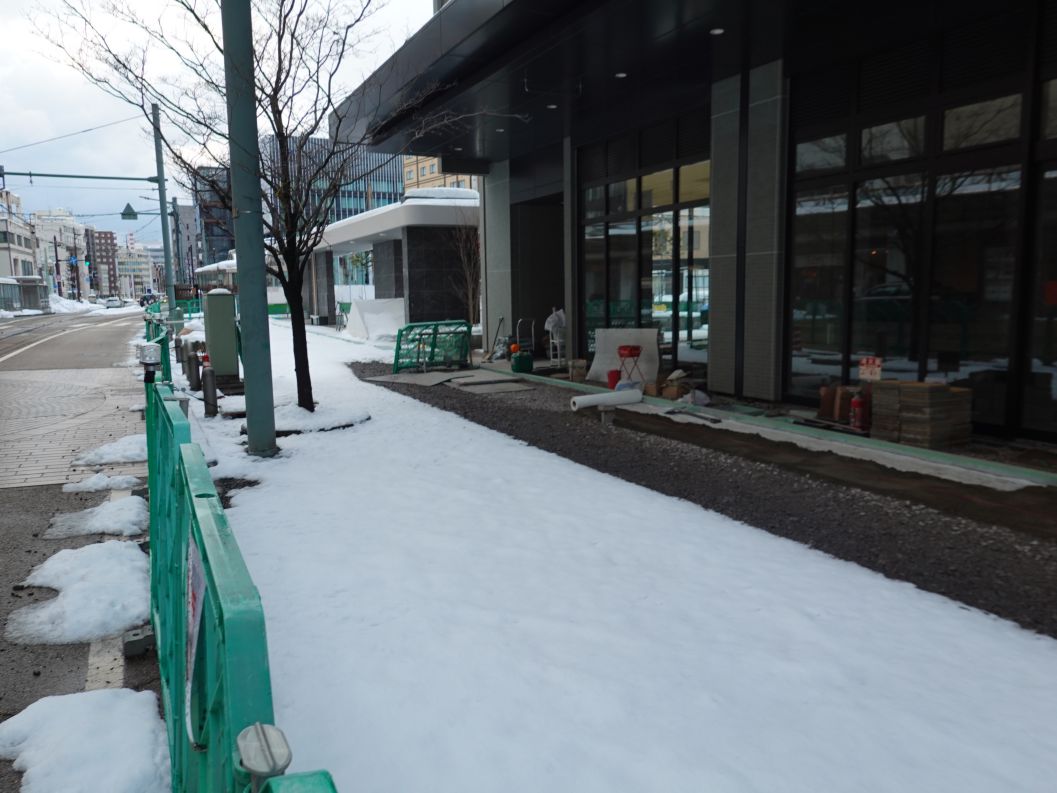 中央大通り反対側の歩道からみた北西角です。雪が積もっています。