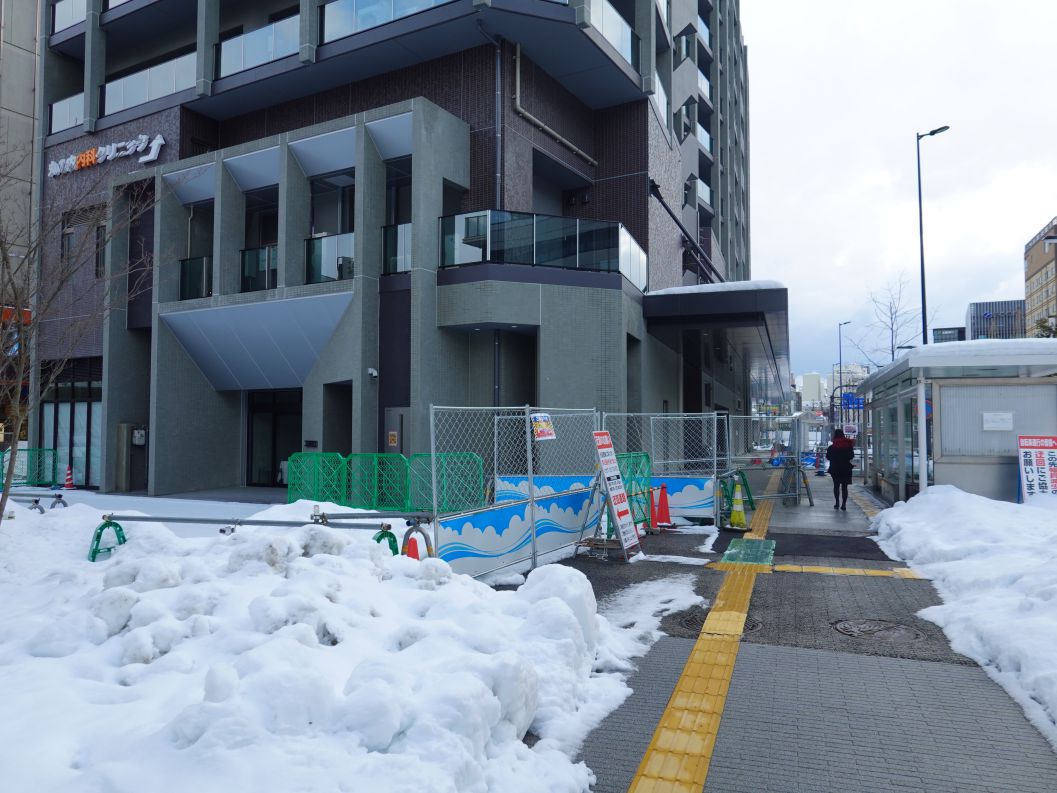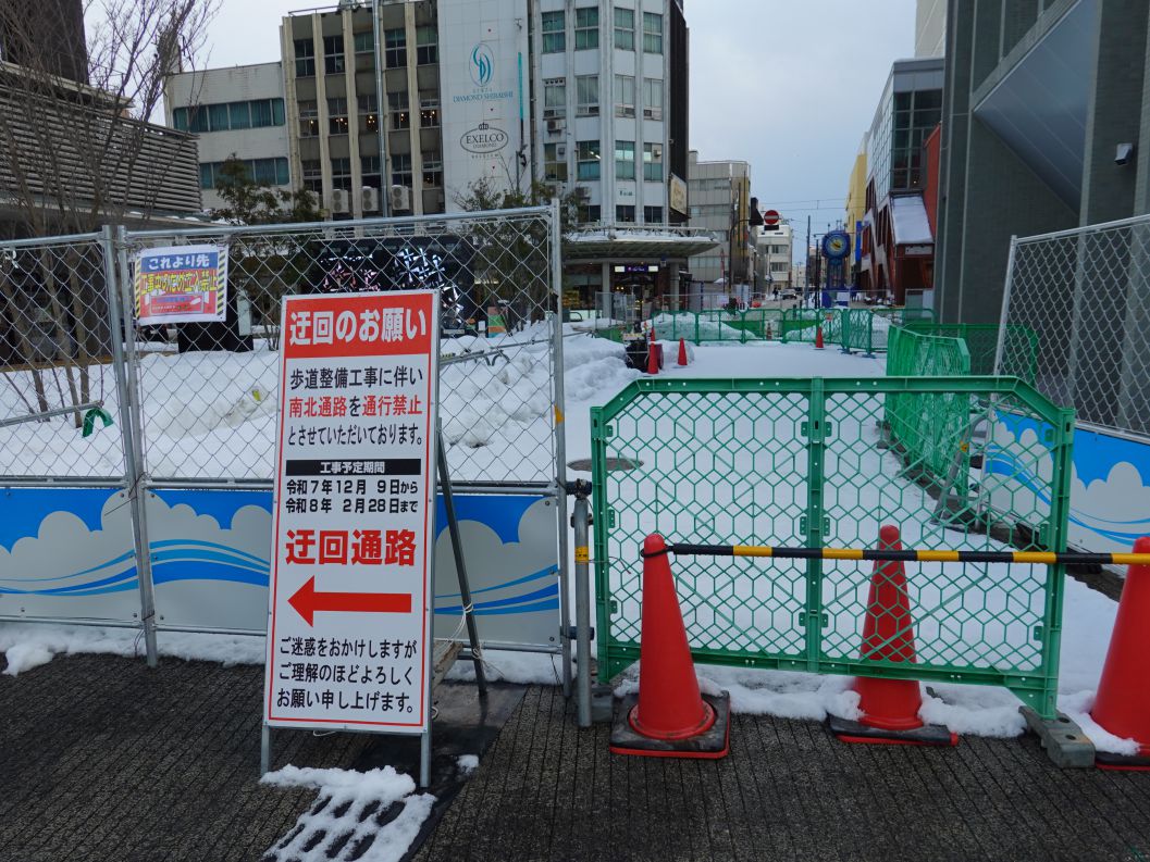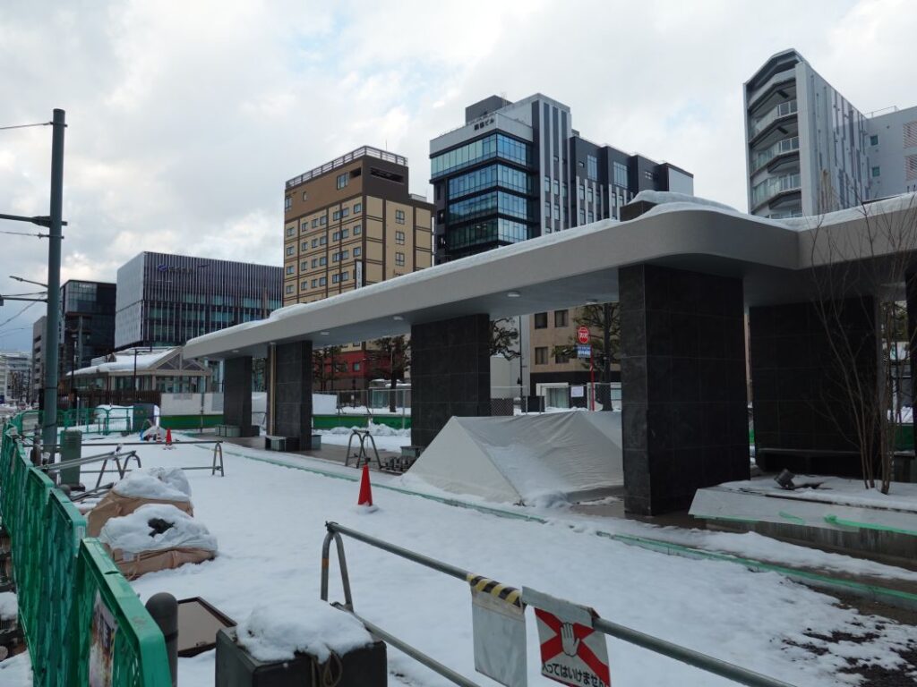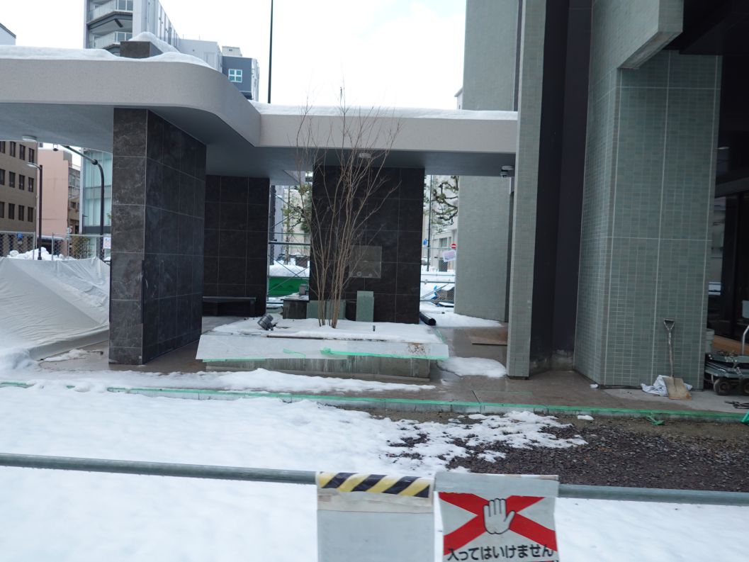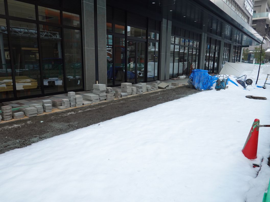 中央大通り反対側の歩道からみた北西角です。雪が積もっています。