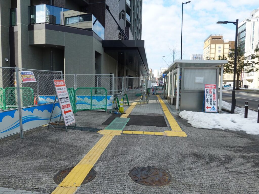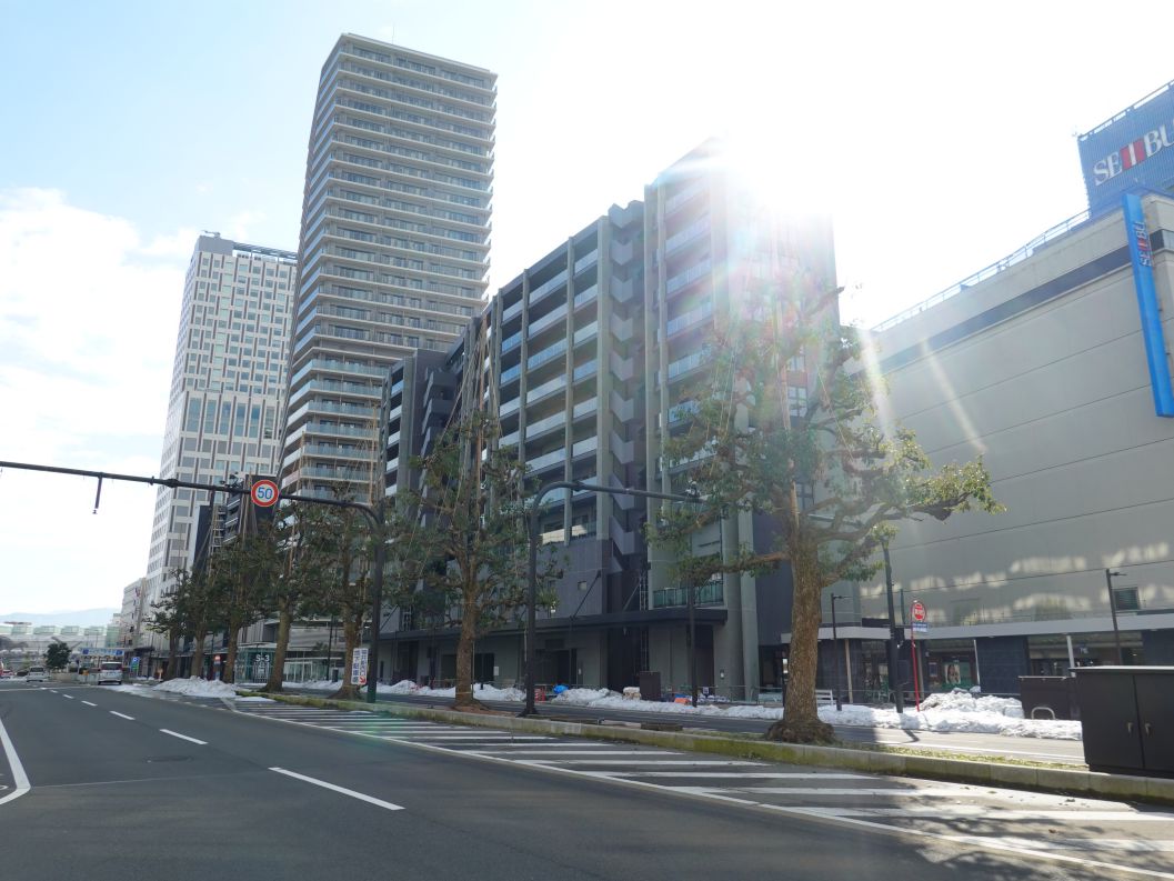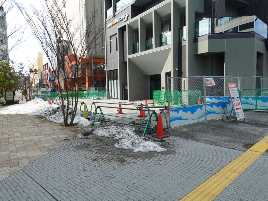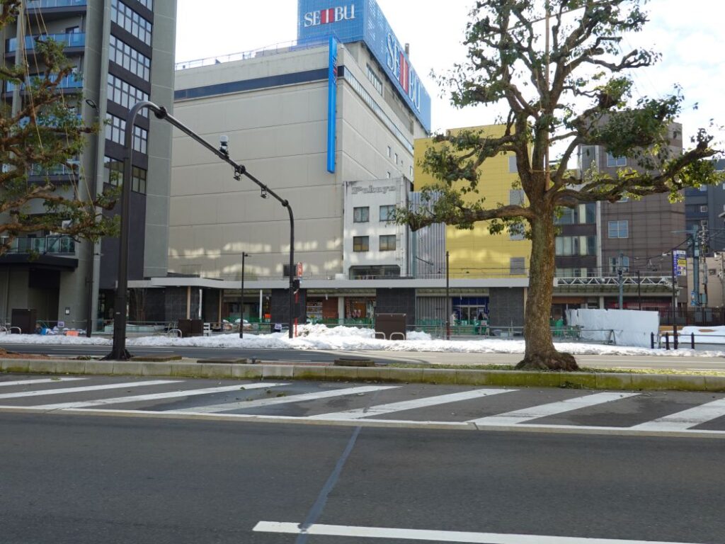 中央大通り反対側の歩道からみた北西角です。路肩には雪が積もっています。