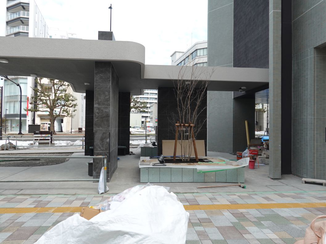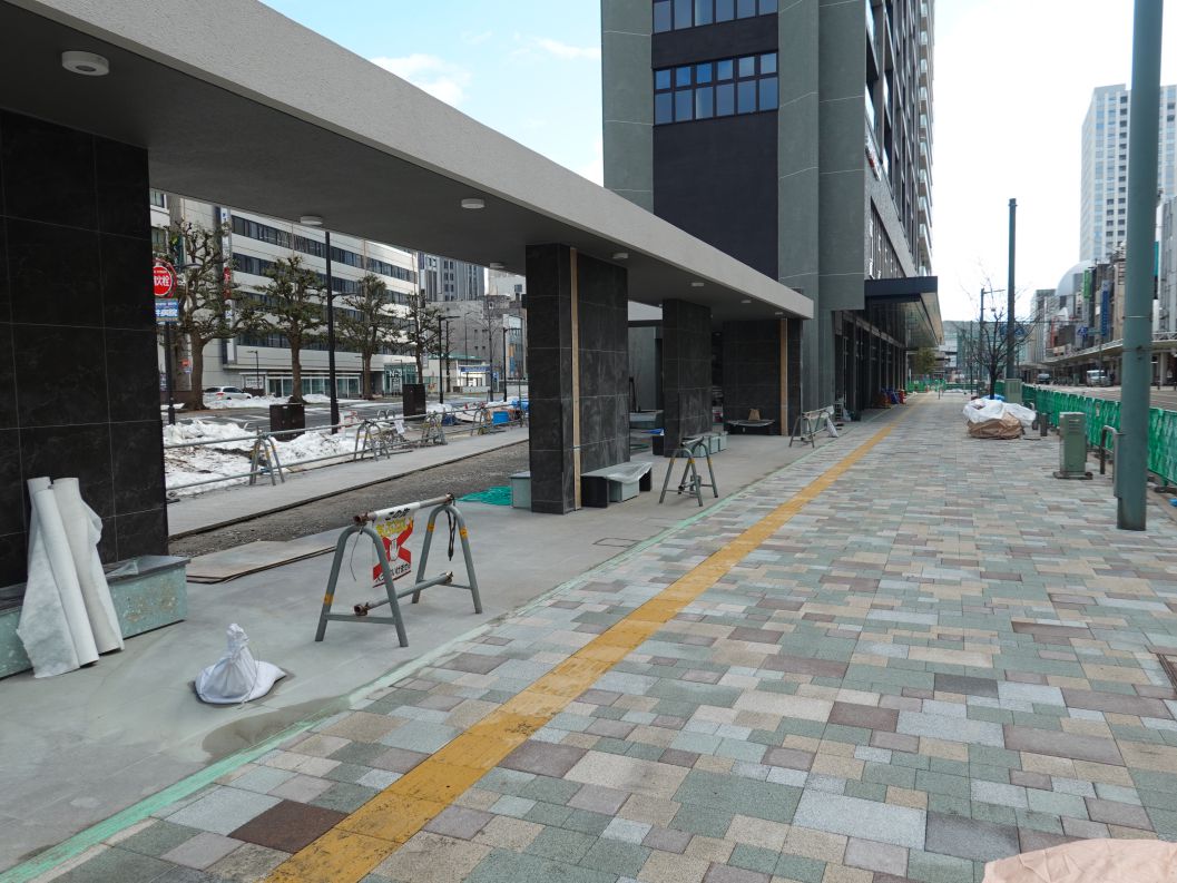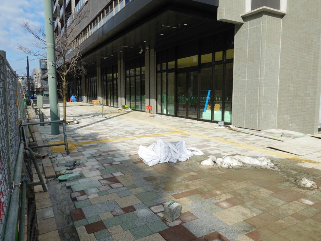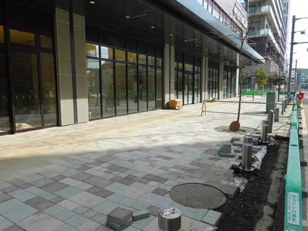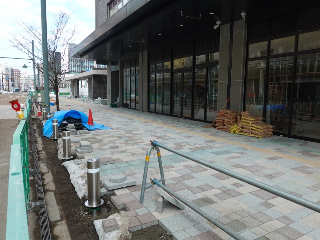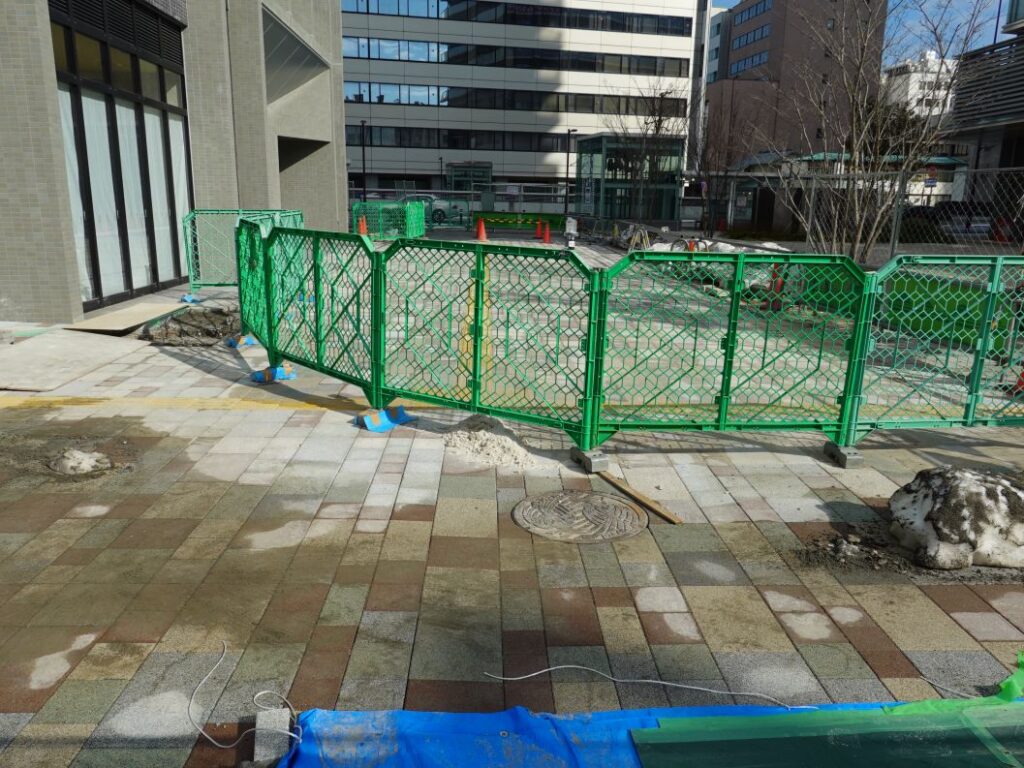 南東角付近の歩道再整備の様子です。インターロッキングの大半が敷き詰められました。