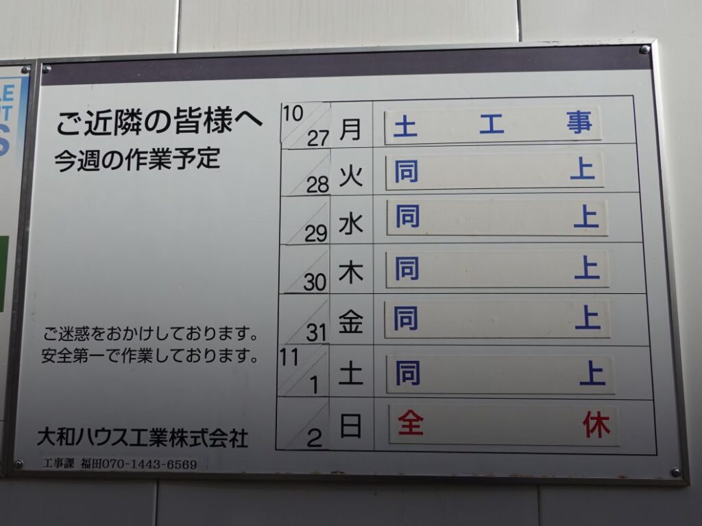 今週の作業予定が掲示されました。2025年10月27日の週は土工事が行われています。