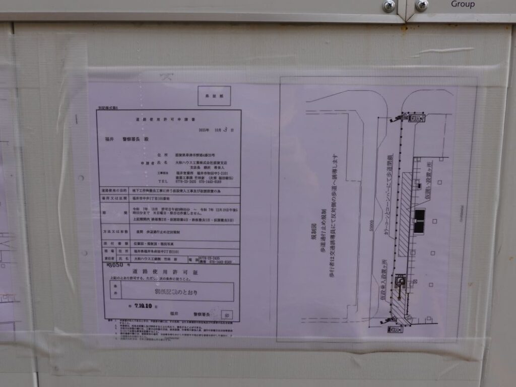 仮囲いの道路使用許可が張り出されていました。これによると12月19日まで作業が行われるようです。
